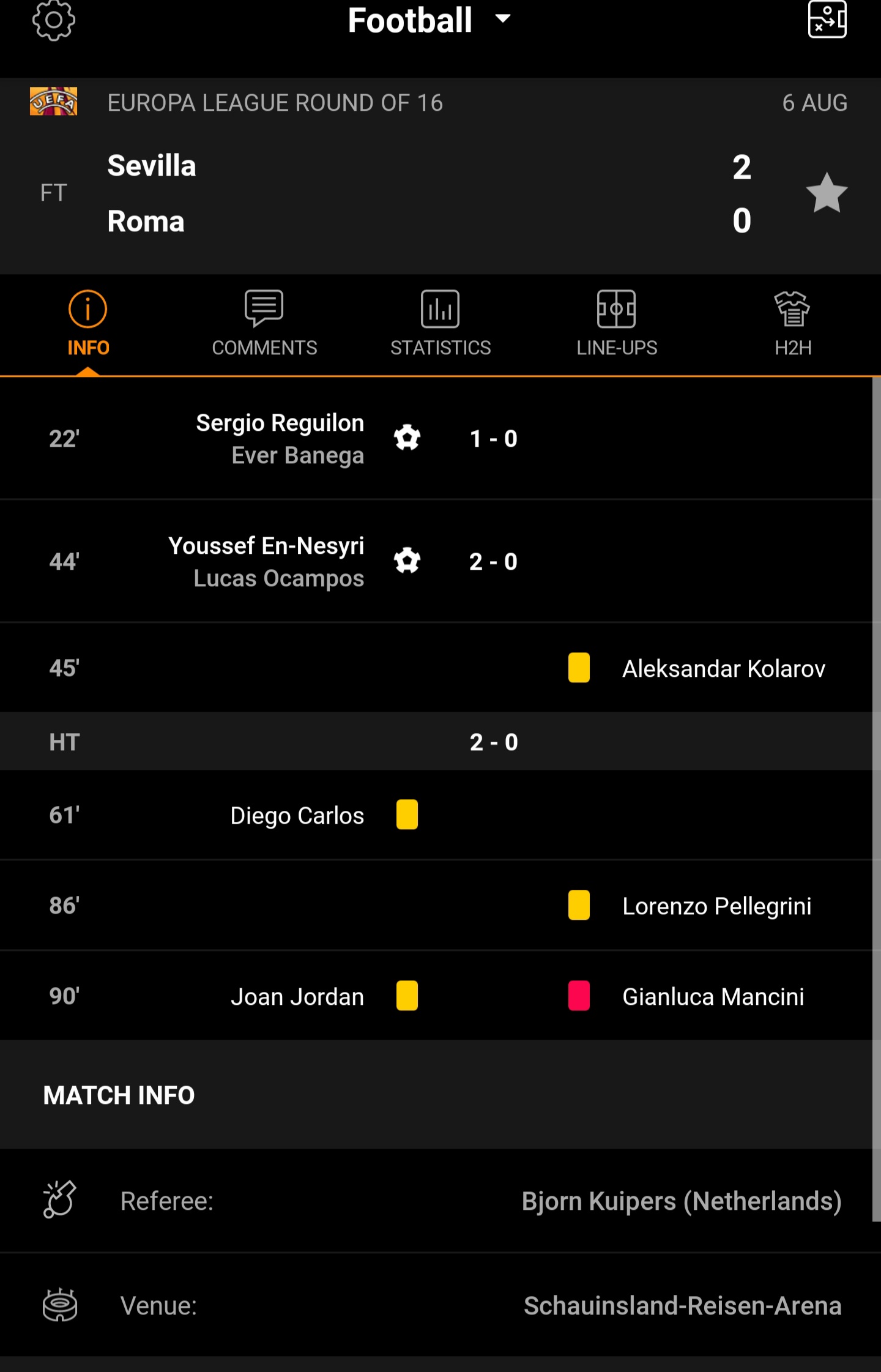 In der zweiten Halbzeit versuchten die Römer dann den Druck auf das Tor der Spanier zu erhöhen. Doch zwingende Aktionen vor dem Kasten von Sevilla-Keeper Bono brachten die Italiener kaum zu Stande. Die freiwerdenden Räume nutzte Sevilla stattdessen für ihr gefährliches Konterspiel. Doch der vermeintliche Treffer zum 3:0 durch Jules Koundé wurde wegen einer Abseitsstellung nicht gegeben. Es blieb daher beim 2:0-Erfolg für die Mannschaft aus Sevilla. Der negative Höhepunkt folgte dann in der Nachspielzeit: Roms Gianluca Mancini sah nach einem Ellenbogencheck gegen Sevillas Luuk de Jong noch die Rote Karte.