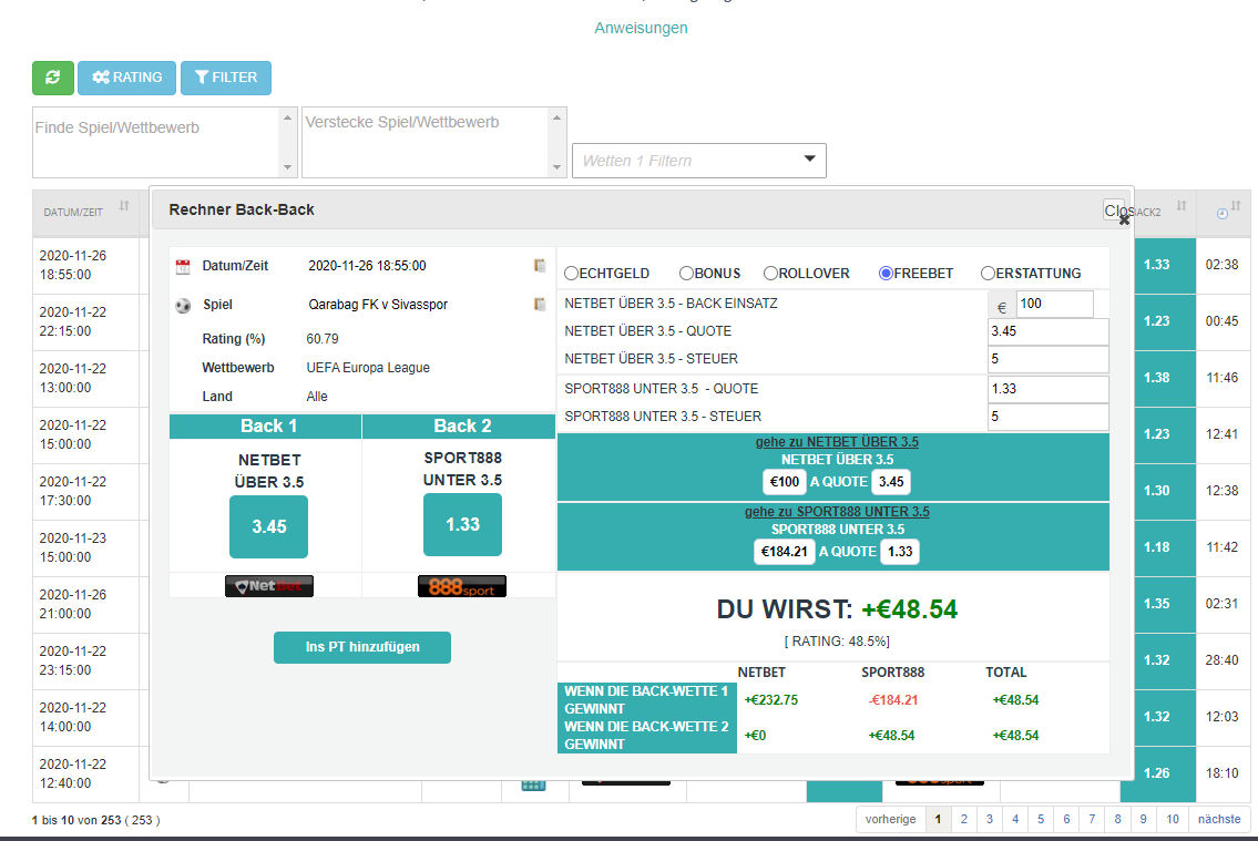 @Chris 1, mal 5€ auf Über 3.5@+120 dann habe ich nochmal 10€ einbezahlt und 10€ Über 3.5@-125