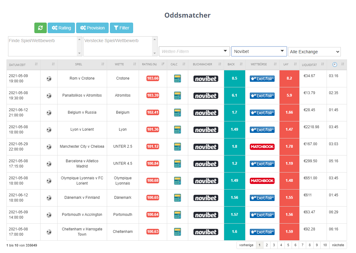 Das mit den Falschangaben passiert recht häufig. Ebenso das der Oddsmatcher die NovibetSpiele nicht findet, obwohl gerade Novibet mit die häufigsten Angebote hat.