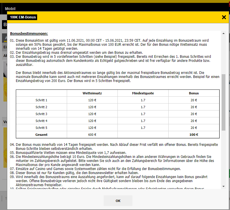 @SWLuca Ist wie der Willkommensbonus bei interwetten. Du zahlst 200€ und setzt dann jeweils 120€, um 20€ Bonus zu erhalten. Der Bonus ist nach jedem Umsatz direkt auszahlbar. Insgesamt machst du das 5x bis du 100€ Bonus erhalten hast.