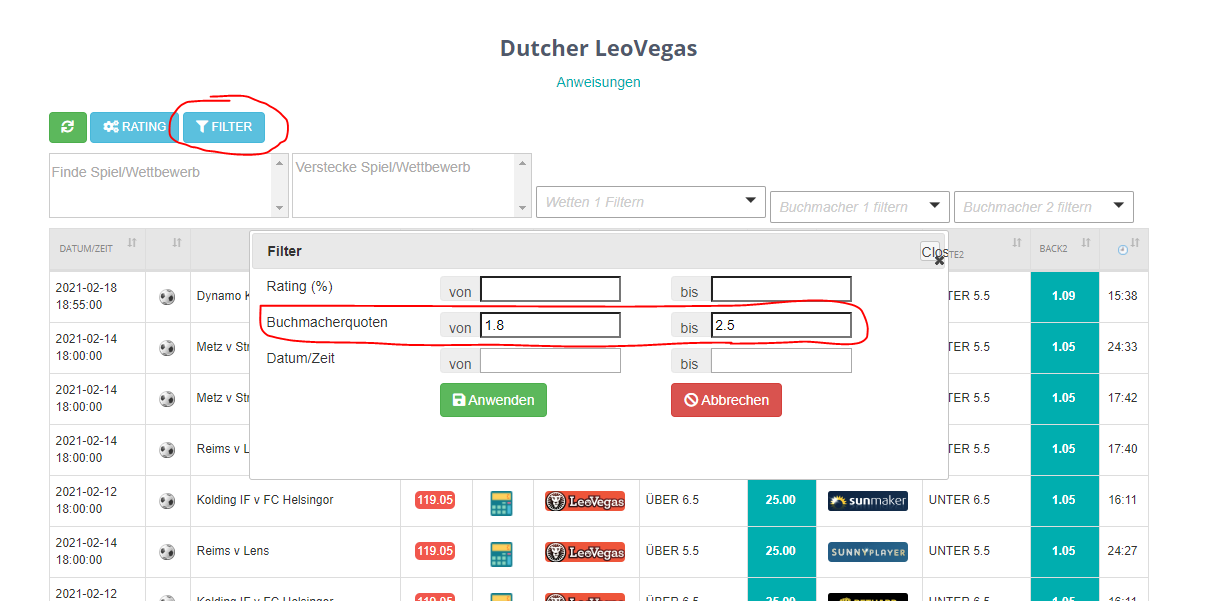 Du kannst den Dutcher und Oddsmatcher so einstellen, sodass Du die Quoten die am naherstens dran sind siehst: