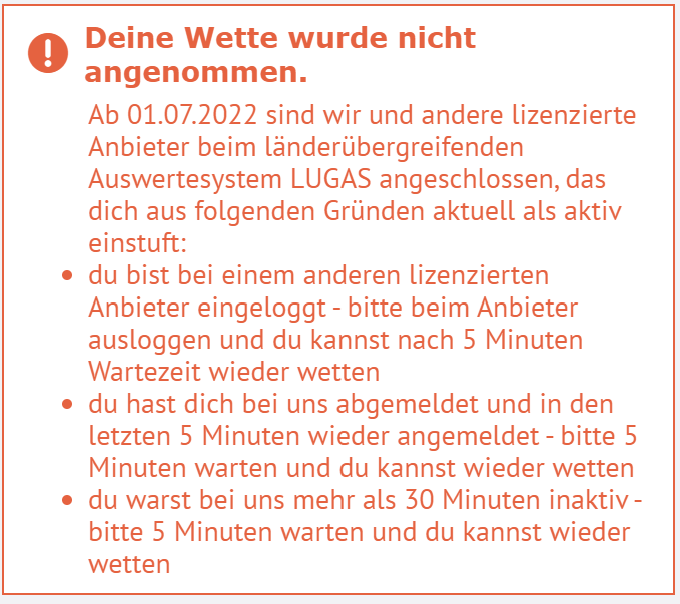 Ich kenne das ja von ein paar Buchmachern schon. Das ich keine Wette setzen kann weil ich woanders erst eingeloggt war. Bei den meisten geht es dann nach 10min. Aber bei Oddset musste ich das letzte mal 3h warten bis dieser Hinweis nicht mehr aufgetaucht ist. Jetzt gerade will ich auch schon seit 2h eine Wette setzen. Habe alle Seiten geschlosse, PC neugestartet. In 5, 10, 30 min Abständen. Auch versucht über Smartphone. Habt ihr eine Idee warum das bei Oddset immer so lange dauert bis es registriert das ich nirgendswo gerade angemeldet bin? Und habt ihr eventuell eine Lösung für das Problem?